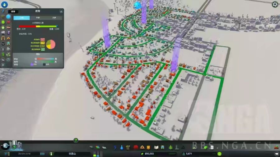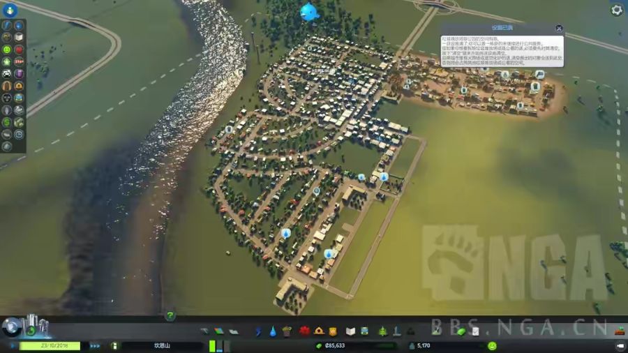 首先,本作的选址系统并不像上面两位“大哥”那么花哨,它既没有什么大地图选址,也没有城市与城市的对接功能,只是提供了简简单单的地形选项,如森林、平原、沙滩、湖滨等。进入游戏后,我们发现游戏的建造原理和机制基本和“前辈们”差不多,一开始我们要把道路连通高速公路,然后用道路来划分和布置居民、工业、商业和办公区,每个区块必须放置其他功能性建筑,如消防局、学校和医院等...这里笔者就不一一介绍了,如果你是SC的老玩家,这些你再熟悉不过了;如果你是个新手,那最好先认真地过一遍教程。这里要提的是,本作的UI和操作方式很有自身特色,而且对划分区域的色彩运用也很大胆,甚至有些卡通风格的即视感。以下图来看,《城市: 天际线》产业的状态栏集中在屏幕左侧,建造栏则是在屏幕下方,简洁明了;二级菜单也很直观,UI的设计可以说是十分友好的,学习成本很低。
