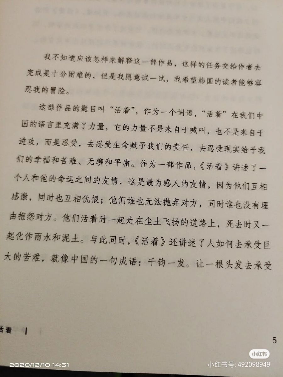 活着,在我们中国的语言里充满了力量。他的力量不是来自于喊,也不是来自于进攻。而是忍受,去忍受生命赋予我们的责任,去忍受生命赋予的幸福和苦难,无聊和平庸。人活着是为本身而活着的,而不是为活着之外的任何事物所活着。——余华
