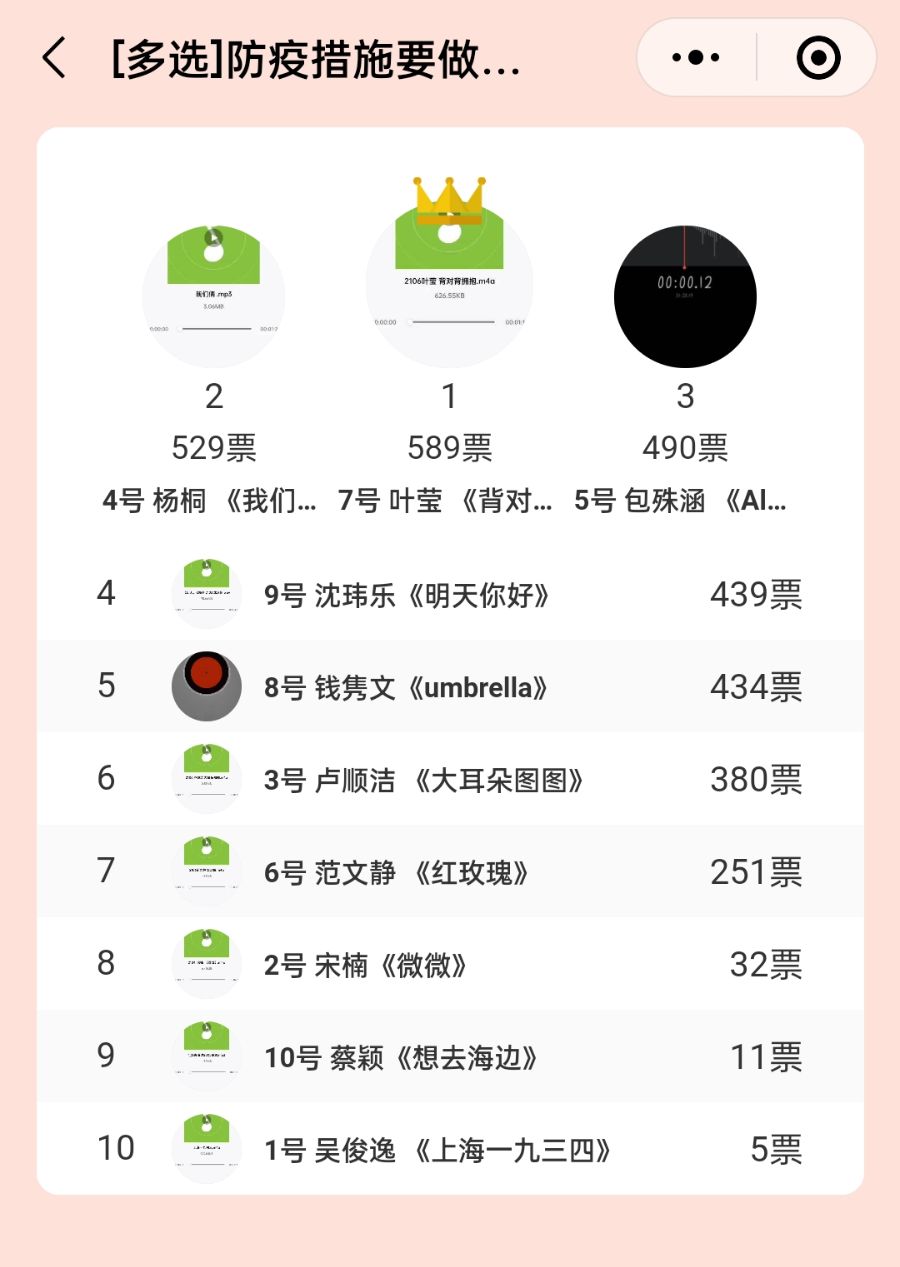 “易起唱唱唱”活动,给热爱歌唱的同学提供了一个展示歌唱才华的平台,经过前期的海选,最终共有十位同学进入最后的决赛投票环节,各班同学在线上为自己喜欢的校园歌手投票,最终2106叶莹、2008杨桐、2008包姝涵分获一、二、三名。参赛同学们唱着一首首耳熟能详的歌曲,还有的同学拿出自己的乐器自弹自唱;同学们选曲风格也各异,有欢快轻松、俏皮可爱的《大耳朵图图》,也有极其需要英语功底的《umbrella》,还有同学借用音乐软件制作背景乐与和声的《想去海边》。音乐是最好的心灵伴侣,在居家期间,也希望同学们能够通过唱歌、听歌的方式放松自己,保持良好的状态,期盼疫情结束回到校园。