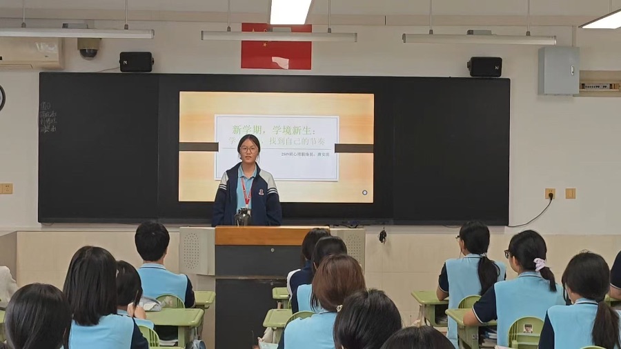 今天的班会由2509班的心理联络员唐安琪同学负责宣讲。她以“新学期,学会新生:学会调频,找到自己的节奏”作为主题,从调频心态、调频行动、调频关系三方面展开今天的班会。