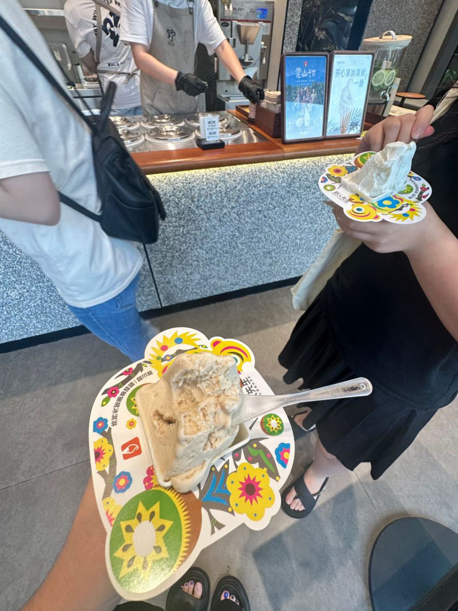 在一家风格简约的店里,冰品的甜意正悄然弥漫。手中的冰淇淋盛在绘满缤纷花卉的托盘上,浅棕色的冰体绵密细腻,银勺嵌入其中,仿佛在邀请人们品尝这份凉沁。身旁有人捧着另一款冰品,洁白的质地似云朵般松软。