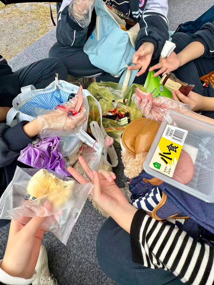 秋游最期待的环节之一就是野餐啦!我们几个小伙伴围成一圈,把各自带来的美食一股脑儿地摆出来,瞬间就成了一个小型“美食集市”。你看那透明盒子里的“小食”,还有包装可爱的面包,各种零食琳琅满目。大家戴着手套分享着美味,有人刚拿起一块点心,就有人迫不及待地伸出手想尝尝另一种零食。我们一边吃,一边聊着学校里的趣事,偶尔还会为了一块好吃的“争抢”一下,欢声笑语在草地上回荡。这不仅仅是一次午餐,更是我们友谊的见证,这些零食的味道或许会淡忘,但此刻的快乐会永远留在我们的记忆里,成为童年秋游最鲜活的注脚。