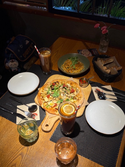 两杯冰饮浸着柠檬片,琥珀色液体在杯壁凝起细珠,吸管轻搅便漾开清爽的气息。餐具在餐垫上摆得妥帖,空盘静候着食物的盛取。这桌烟火气里,没有催赶的节奏,只有鹅肝的绵密、意面的筋道与冰饮的清爽慢慢厮磨,一口下去,连晚风从窗缝溜进来,都裹着草木香,成了这餐食里最恰到好处的佐料。