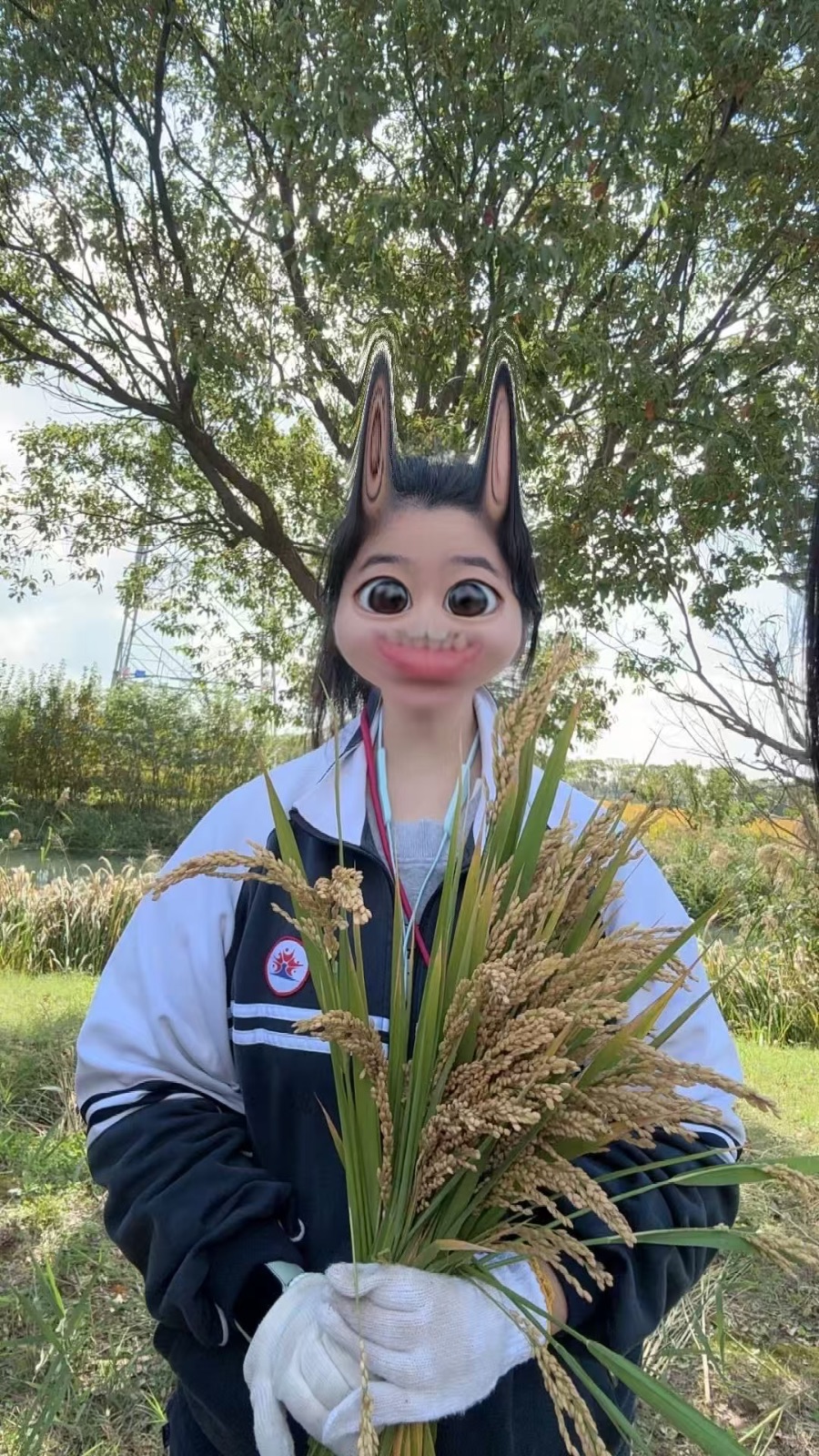 秋阳把稻田烤成金海,我握小镰刀冲进稻浪。左手抓秆,右手一拉,稻香像烟花炸满脸。汗水混碎叶粘在颊上,却掩不住笑。同学们比谁的稻垛高,结果把自己埋进金色城堡。老师按下快门,定格我举稻欢呼,像举着一束阳光。午后,我们啃新米饭团,软糯里带着田野风,连呼吸都是甜的。归途车窗外的夕阳像巨大的橘子,我抱一束稻穗,心里继续狂欢。割稻子真是太开心了!每一棵稻穗都像在为我们鼓掌,秋风是最棒的DJ,把笑声吹向更远的地方。