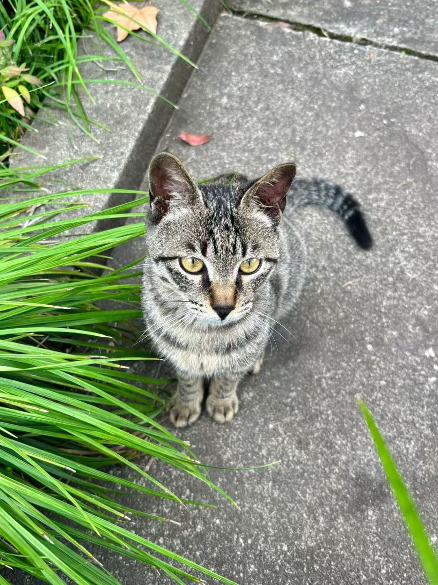 灰扑扑的水泥地砖上,蜷着只虎斑小猫。它把爪子并得规规矩矩,像刚挨过训的小朋友,可那双琥珀色的圆眼睛却瞪得溜圆,直勾勾盯着镜头——瞳仁里裹着点警惕,又掺着点好奇,耳尖还悄悄支棱着,连耳郭里粉粉的绒毛都透着机灵。身侧的青草长得泼泼洒洒,嫩绿色的叶尖蹭着它的胡须,风一吹就晃得小猫鼻尖发痒。地砖缝里嵌着片蜷成小扇子的枯叶,旁边还沾了点淡粉的花瓣碎,衬得它灰褐相间的斑纹毛更软和了,像裹了层揉皱的旧绒布。这小家伙明明缩在角落里,却偏要摆出“领地主人”的架势,连尾巴尖都轻轻勾着,像随时要蹦起来探秘。阳光漫过草叶落在它脑门上,给那点小倔强都镀了层暖绒绒的光。