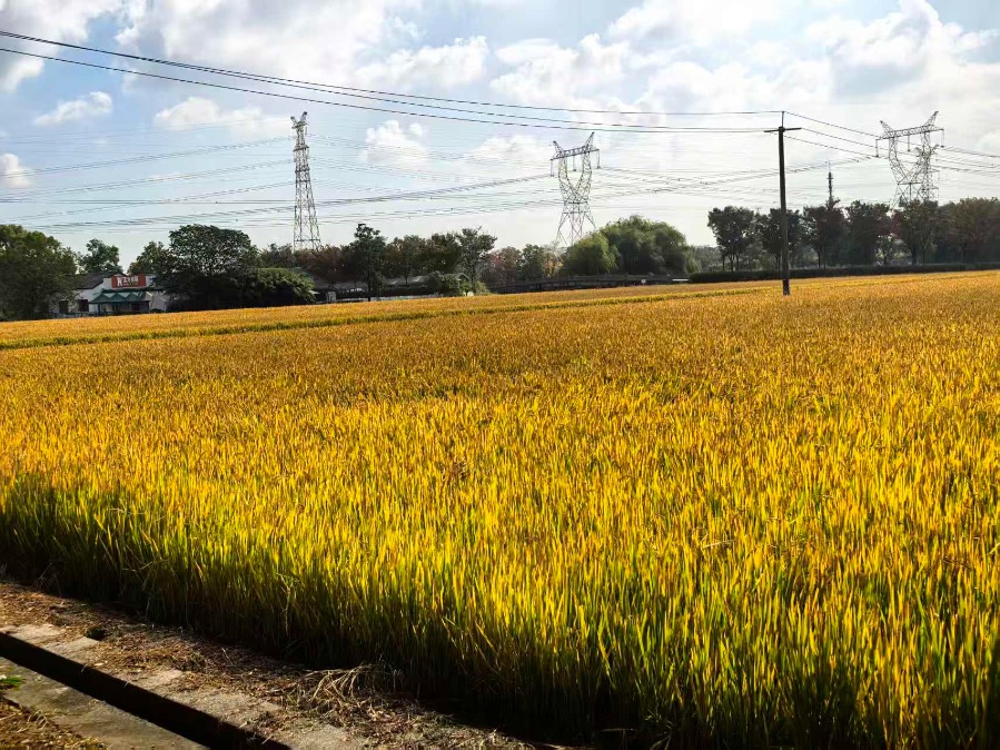 一进公园,金黄的稻田就映入眼帘,沉甸甸的稻穗弯着腰,风一吹,掀起金色的波浪,好闻的稻香扑面而来。沿着木栈道往前走,两旁的梧桐树叶子变黄了,像一把把小扇子,飘落在地上,铺成了一条金色的小路。我们踩着落叶,脚下发出“沙沙”的声响,真有趣。
