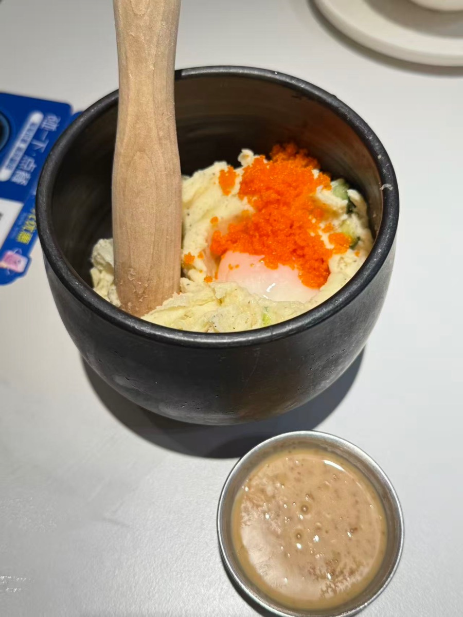 橙红飞鱼籽,颗颗饱满如小珍珠,在光线下泛着晶亮的光泽,中间卧着半颗溏心蛋,蛋清莹白、蛋黄晕着浅粉,像藏在棉絮里的落日余温。木杵斜插在泥里,顶端沾着细碎的土豆屑,碗边嵌着脆黄瓜丁,脆嫩与绵密在碗里撞出层次。