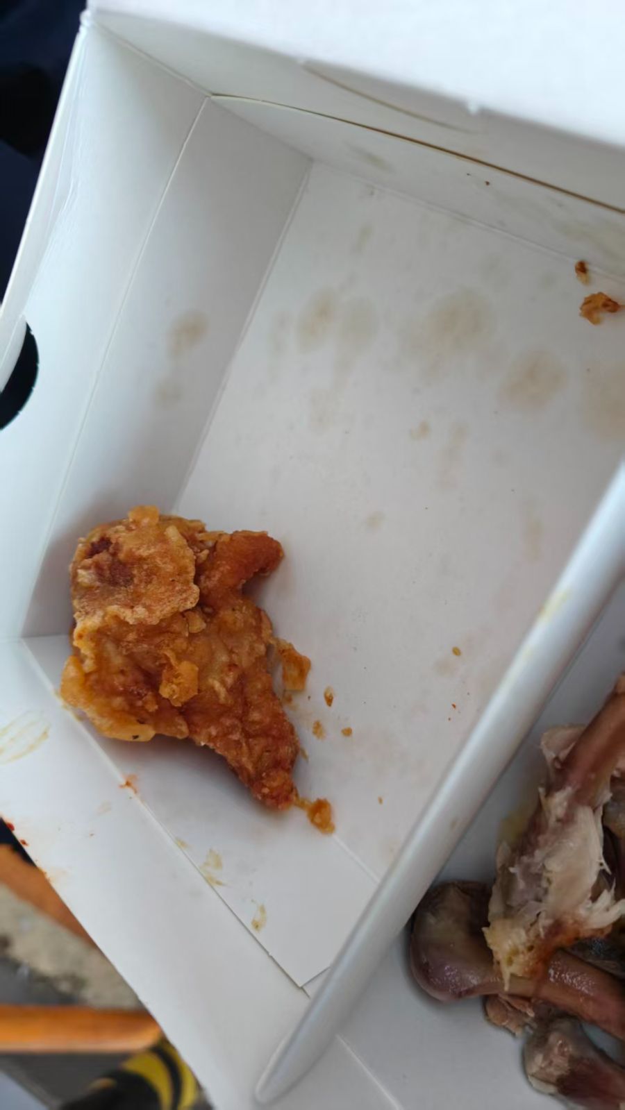 打开外卖袋时,金黄的香气裹着热气扑出来,我还笑话这纸盒小得可怜——结果啃完鸡翅、撕净鸡腿,才发现这最后一块脆皮的可爱:酥壳上沾着细碎的辣椒粉,肉缝里浸着油润的汁,连掉在盒底的渣都裹满了咸香。