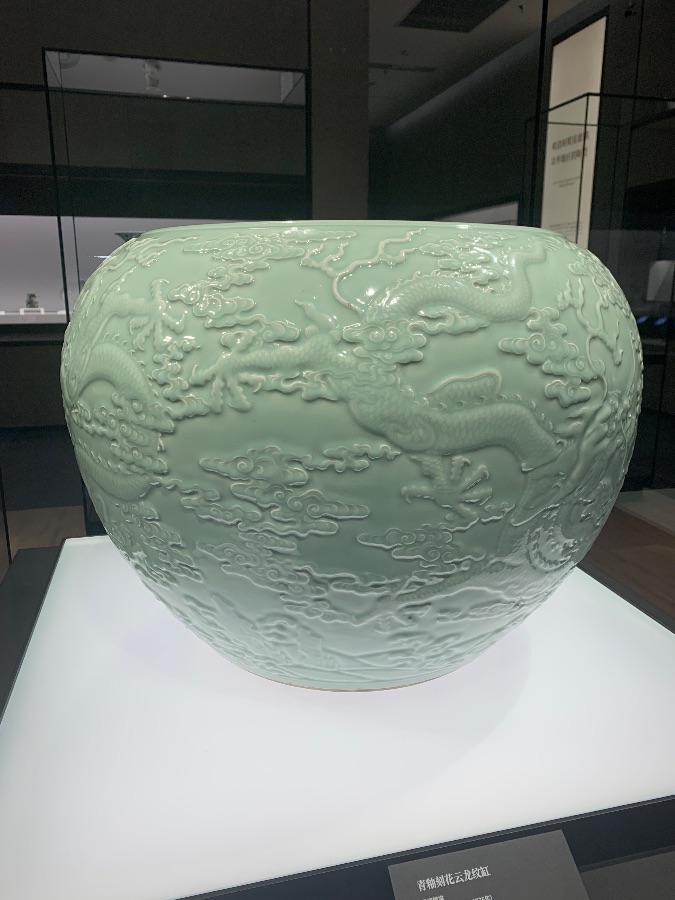 器物置于白色展台上,背景是博物馆简约的深色展柜与玻璃隔断,冷调的灯光打在瓷缸表面,让青釉的质感与浮雕的细节愈发清晰,整体氛围庄重典雅,既展现了古代制瓷工艺的高超水准,也彰显出云龙纹所蕴含的吉祥威严的文化寓意,静静诉说着传统陶瓷艺术的魅力。