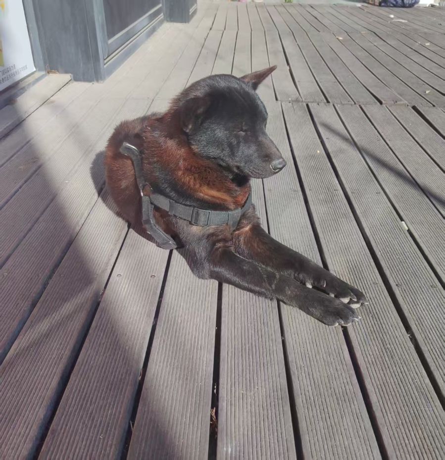 午后的阳光斜斜洒在木质栈道上,一只黑棕相间的狗狗正蜷在木板上酣睡,成了街头最治愈的风景。它的毛发以纯黑为底色,脊背与脖颈处晕开深浅不一的棕红,像被阳光揉碎了抹在皮毛上,在光影里泛着柔和的光泽。