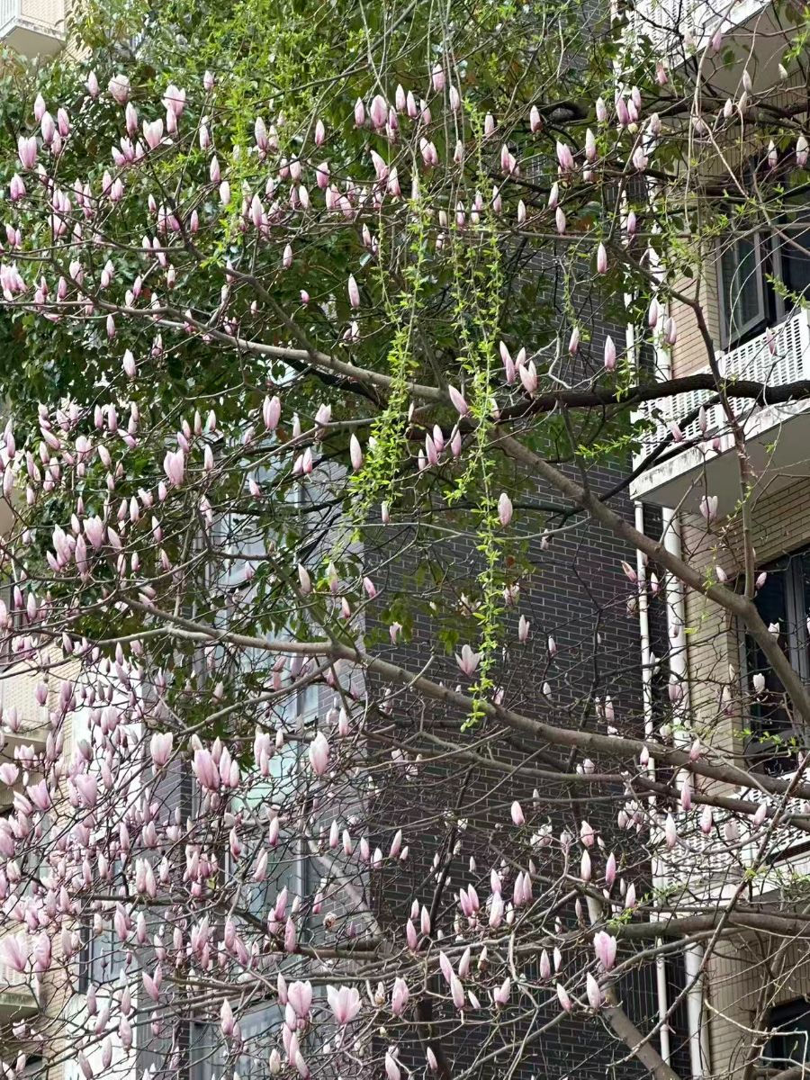 周末下楼散步,一抬头就被小区里的这株粉色玉兰惊艳到了!满树的花苞挨挨挤挤地挂在枝头,粉粉嫩嫩的,像蘸了胭脂的毛笔尖,又像藏着一整个春天的温柔。这应该是二乔玉兰吧,花瓣外层带着淡淡的粉紫,内层却是纯净的白,渐变的色调特别好看。枝头还冒出了嫩绿的新芽,新叶与粉花苞相映,把春日的生机衬得淋漓尽致。风一吹,花苞轻轻晃动,仿佛下一秒就要绽放成满树繁花。站在花树下仰头看,花瓣的粉、枝叶的绿、天空的浅灰,交织成一幅温柔的春日画卷。原来春天真的藏在每一处细节里,这株悄悄盛开的玉兰,就是小区送给我们最浪漫的春日礼物。